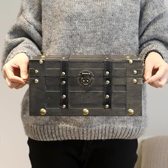 Vintage Wooden Treasure Chest (11" x 7.1" x 5.5") - Decorative Pirate Box with Sturdy Hinged Lid - Antique Style Storage Trunk for Classroom, Keepsakes, & Party Props, Black