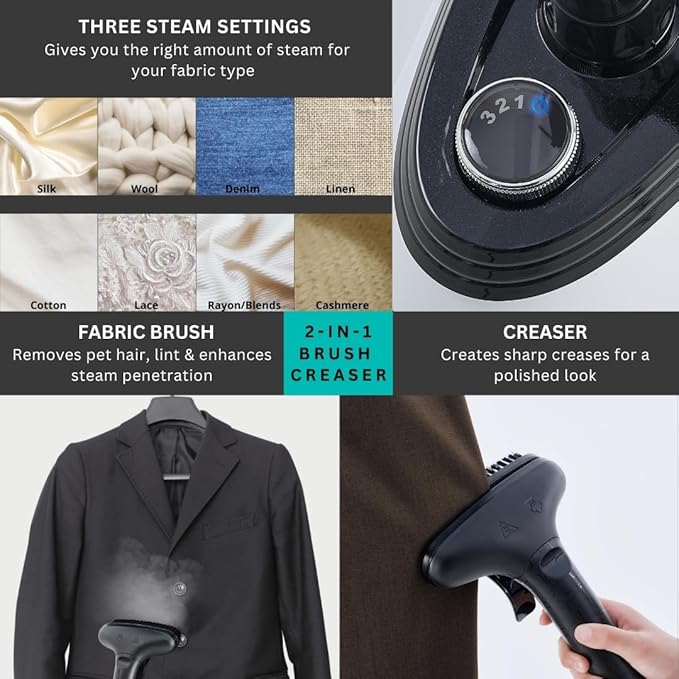 - Powerful 1800W Steam for All Fabrics – Featuring three adjustable steam settings, this high-performance fabric steamer safely and effectively smooths out wrinkles on delicate silks, thick cotton, and everything in between.