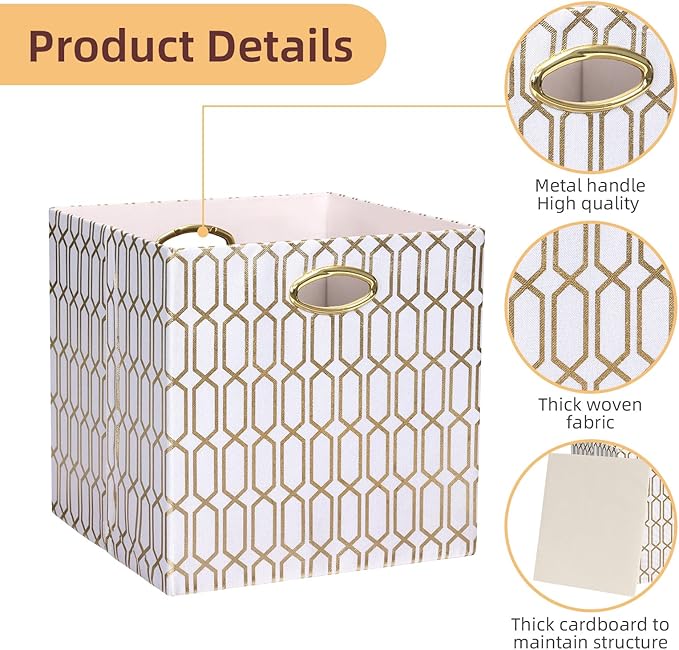 13x13x13 Storage Cube Bins, Collapsible Storage Bins Fabric Storage Cubes Organizer Baskets Box Drawers for Shelves, Closet, Wardrobe, Bookshelf, Cabinet, 4 Pack, White/Shiny Gold