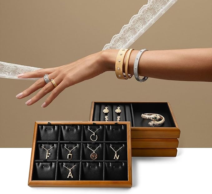 - ★Application:This solid wood jewelry tray is great for personal use at home,which can be stacked on your drawer or dresser to save space; And perfect for a countertop jewelry display in stores or trade shows. Easily mobile the tray from the showcase to allow customers to view your jewelry from the counter-top.