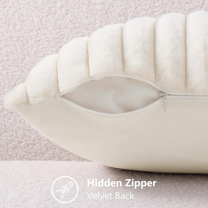 decorUhome Faux Fur Spring Throw Pillow Covers 20x20 Set of 2, Decorative Soft Plush Striped Neutral Couch Pillow Covers with Velvet Back for Sofa, Bed, Living Room Home, Cream White