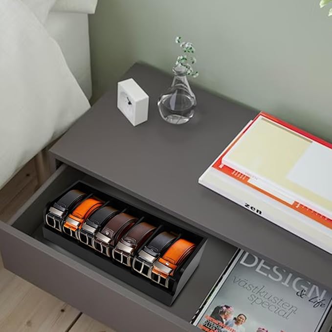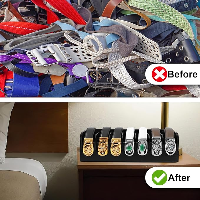 - Suits Most Belts:The 7 compartments belt storage organizer is about 15.7 x 6.6 x 4.6 inches, each 2.2 inches apart, and can hold most of the belts. It is convenient for you to put in and out.