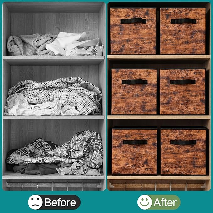 Stero Fabric Storage Cubes, 6 Pack Foldable Storage Bins with Handle, 13 Inch Box for Shelves, Closet, Organizer, Rustic Brown and Black