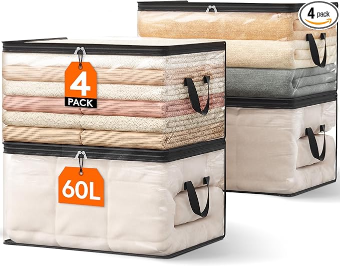 Lifewit 4 Pack Clear Clothes Storage Bags, 60L Plastic Blanket Vinyl Foldable Moving Bags with Zipper, Closet Organizers and Storage Containers for Bedding, Duvet, Pillow