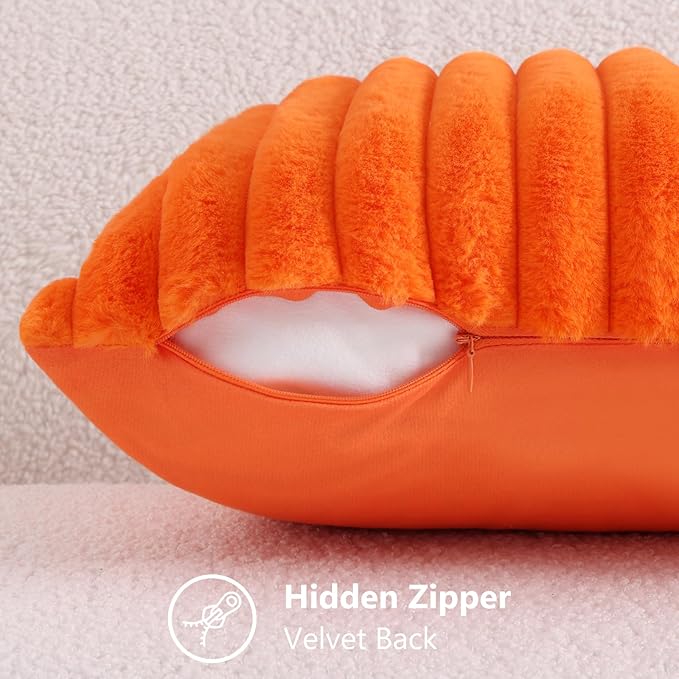 decorUhome Faux Fur Spring Throw Pillow Covers 16x16 Set of 2, Decorative Soft Plush Striped Neutral Couch Pillow Covers with Velvet Back for Sofa, Bed, Living Room Home, Orange