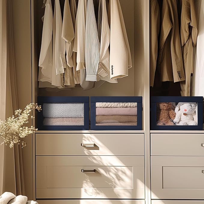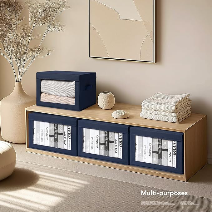Organizing Bins with Lid - 4 Pack Foldable Clear Window Storage Bins, Large Storage Boxes with Handles, Storage Containers for Clothes, Towel, Blanket, Sheet, Navy Blue