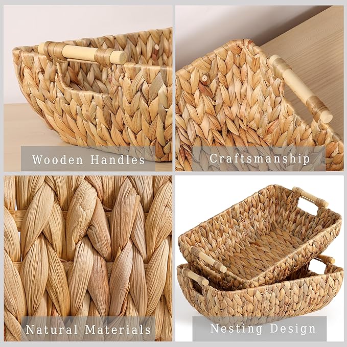 Water Hyacinth Storage Baskets with Wooden Handles,Large Wicker Baskets for Organizing Set of 2