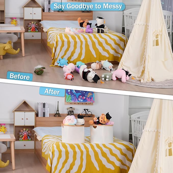 - 【Collapsible Basket Set】When the collapsible storage basket is not in use, it can be easily folded by simply pushing down the support rod. Fabric baskets are easy to clean, simply dust with a soft dry cloth.
