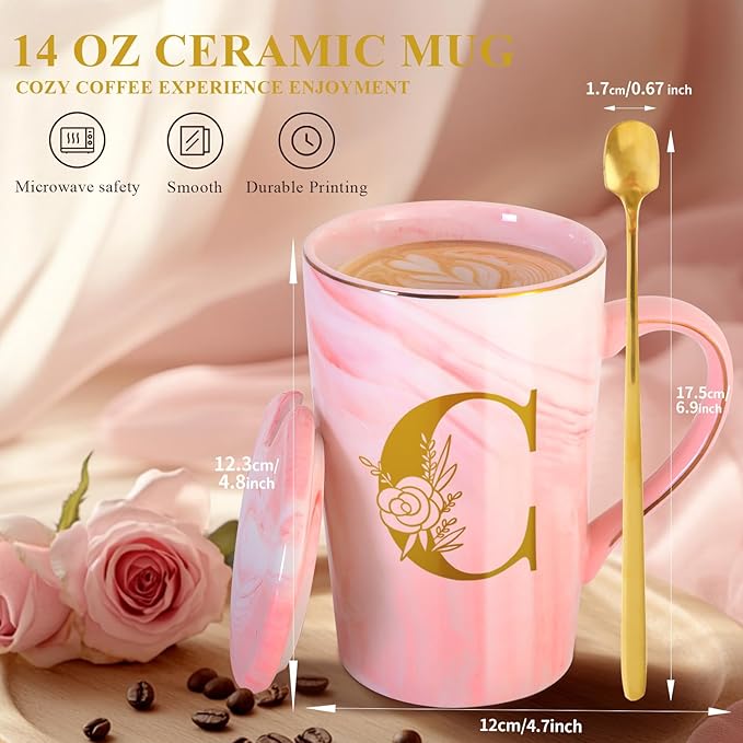 - Personalized Elegance: Discover the perfect blend of beauty and functionality with this personalized ceramic coffee mug, available in 26 letter designs. Its stunning pink marble finish and gold foil detailing make it an elegant gift for any special woman in your life.