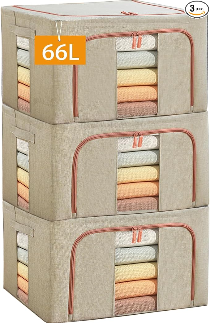 Large Storage Bags,Stackable Clothes Storage Bins with Hold Shape Metal Frame,Foldable Closet Organizer Containers with Zipper,Clear Window,Thick Fabric for Seasonal Clothing,Bedding (3 Pack, 66L)