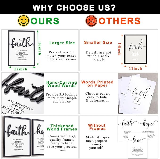 - 【Hand Carving 3D Wood Sign】Unlike other cheaper paper print words, our faith hope love wall decor inlaid with 3d hand-carving wood words [Faith], [Hope], [Love], that makes the bible verses wall decor looks more stereoscopic and eye-catching. The 3D christian wall art gives your room an instant make-over, promotes your taste and texture of daily life, it helps you get a lot of compliments.