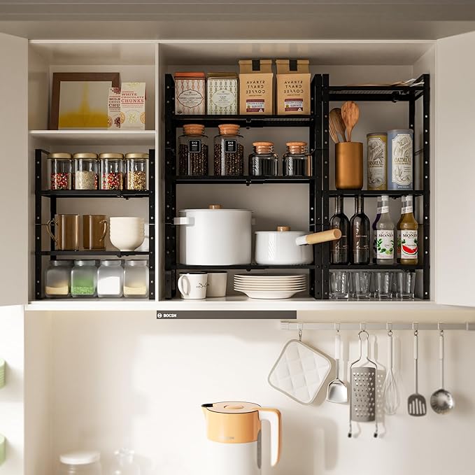 Multi-Functional Metal Shoe Rack,Expandable Adjustable Stackable Kitchen Organizer,Metal Shelf risers for cabinets, Kitchens and Closet, Bathroom(1Pack/Black/Medium)