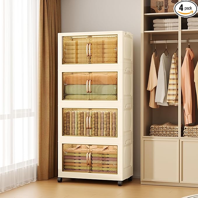 102QT Plastic 4 Tier Storage Bins with Lids,Folding Storage Box with Doors and Wheels Stackable Storage Bins,Closet Organizers and Storage for Living Room,Office,Dorm