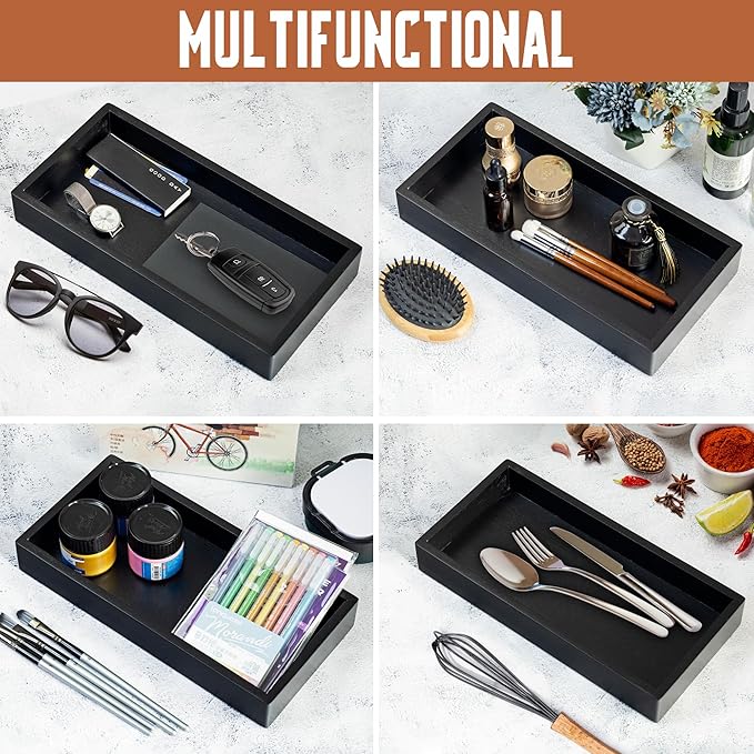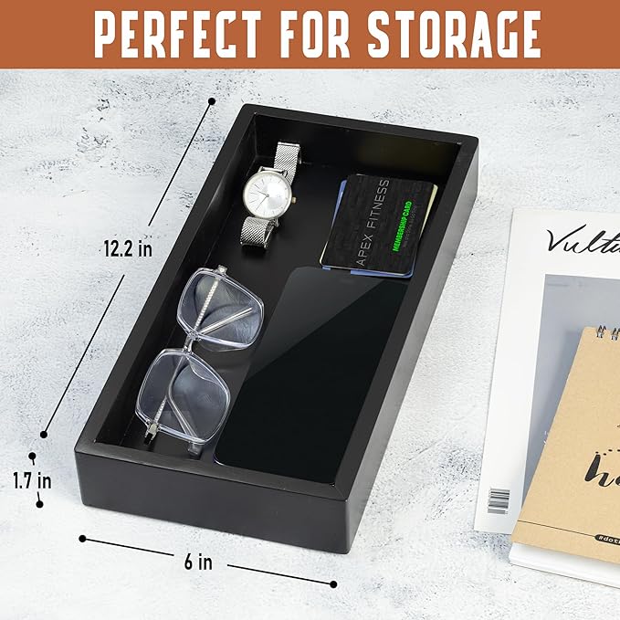 - A Must-Have Valet Tray for Your Home: This decorative tray is the ideal size 12.2” L x 6” W x 1.7” H to place anywhere in your home, keeping it within easy reach. Please measure the space where you want to put this wooden organizer tray to ensure that it is suitable. Its perfect size allows vanity trays to be used in various settings, such as entryways, bedrooms, or offices, adapting to different needs.