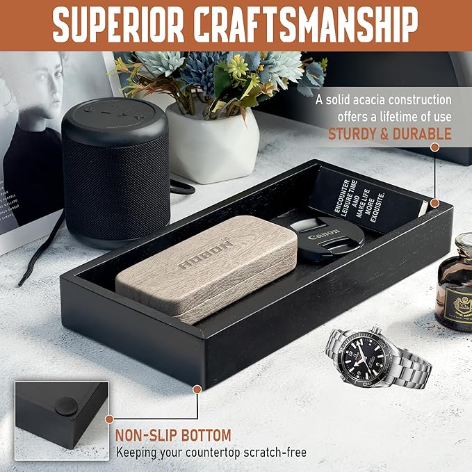Demigo Acacia Valet Tray, 12.2 x 6 in Men and Women Wooden Catch All Tray for Entryway Table, Bedside Nightstand Organizer, Home Office, Tabletop Storage Vanity for Wallet, Jewelry, Perfume (Black)