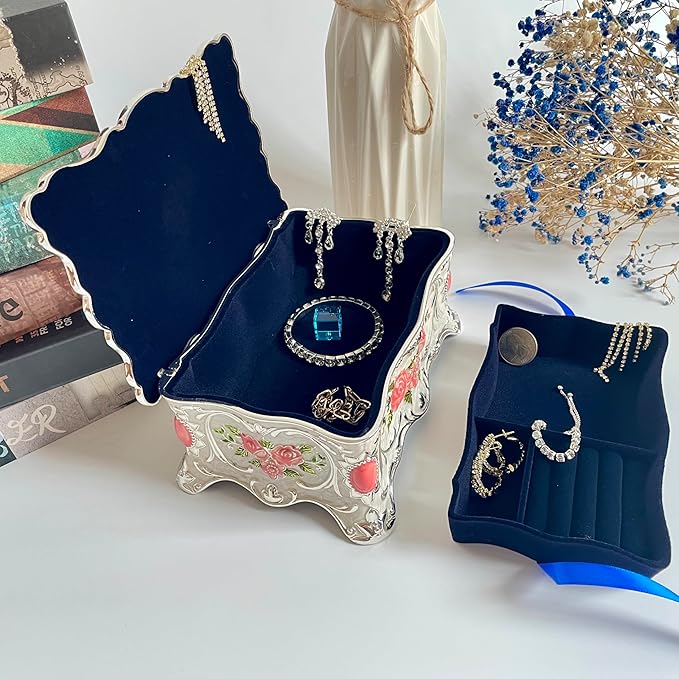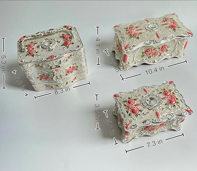 Truewon Jewelry Chest Rose Pastoral Style Metal Box Trinket Vintage Trinket Gemstone Storage Tray Treasure Souvenir Gift Case for Girls Women (White Pink Golden, Large)