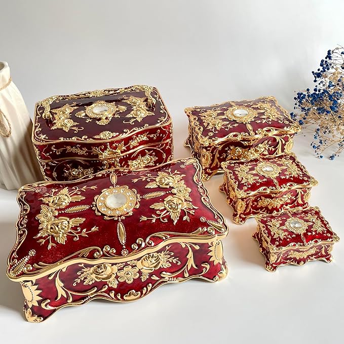 Truewon Jewelry Chest Rose Pastoral Style Metal Box Trinket Vintage Trinket Gemstone Storage Tray Treasure Souvenir Gift Case for Girls Women (Golden Red, Large)