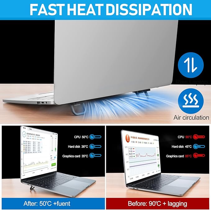 - Enhanced Cooling: This Foldable laptop stand raises the laptop's height, preventing your laptop from overheating and crashing when you use laptops for a long time.