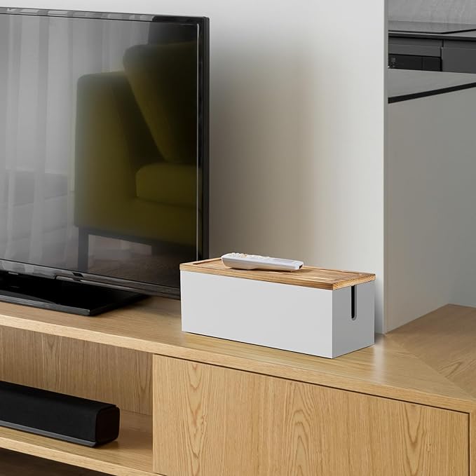 Large Cable Management Box, Wooden Cord Organizer Box for Desk, Floor, Office to Hide Extension Cords Power Stripes Surge Protectors Chargers Wires, White