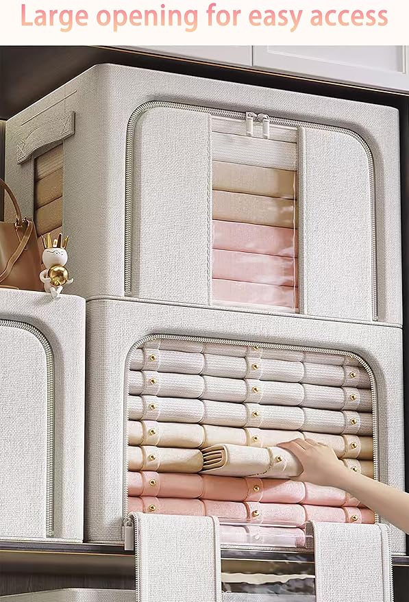 Clothes Storage Bins, 2 Pack Bedding Organizers with Handles, Stackable Metal Frame Closet Organizer, Visable Windows, Clothing Organization for Sweatshirt, Blanket, Long Dresses, (66L Cream White)