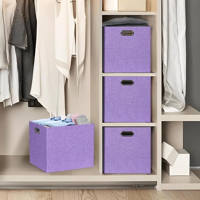 13x15x13 Storage Cube Bins, Foldable Storage Cubes, Fabric Organizer Basket Bin, Solid Containers Decorative Storage Boxes for Shelves Wardrobe Closet Home Office, 4 Pack, Purple
