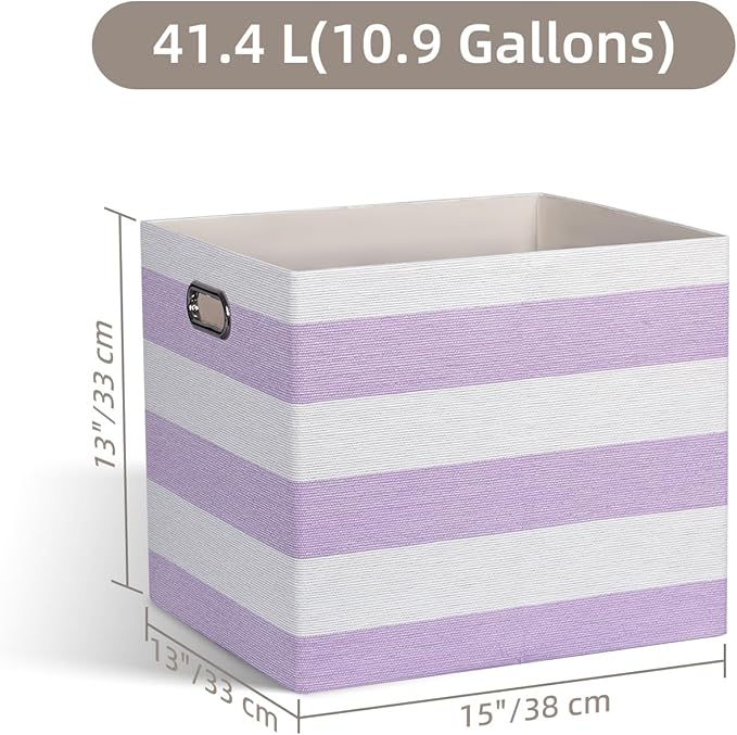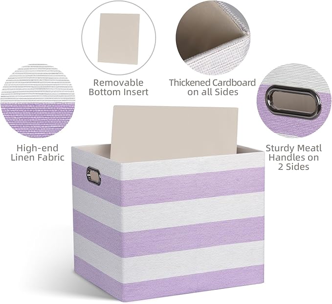 13x15x13 Storage Cube Bins, Foldable Storage Cubes, Fabric Organizer Basket Bin, Striped Containers Decorative Storage Boxes for Shelves Wardrobe Closet Home Office, 4 Pack, Purple/White