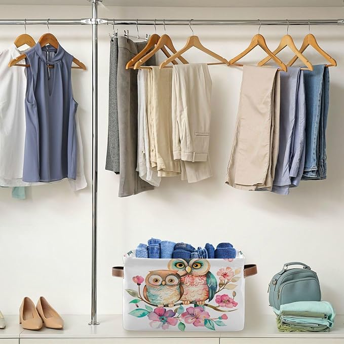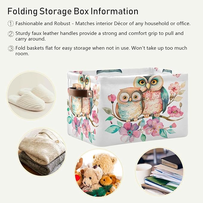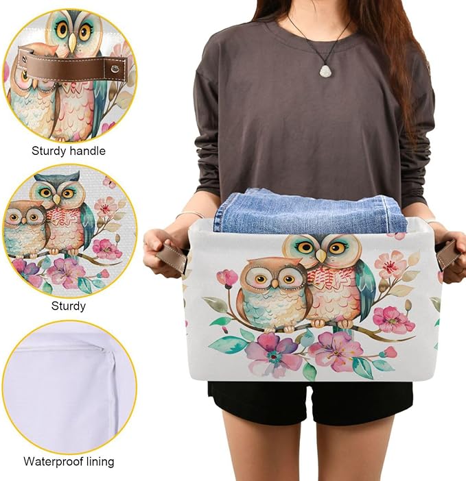Large Storage Basket Cute Owl Couple Flowers Storage Bin Cube Canvas Fabric Organizer Handles Collapsible for Clothes Toys Bedroom Decorative