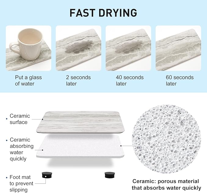 - QUICK ABSORBING STONE TRAY: Super Water Absorption, the tray for bathroom sink are made of absorbent ceramic that can wick the moisture immediately and dry fast, protecting your surfaces from pesky condensation and spills.