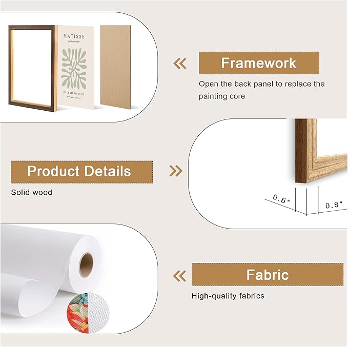- High quality frame material: The frame is made of high-quality wood, presenting a natural wood texture and a warm texture. The frame has been finely polished and processed, with smooth and rounded edges, providing not only stable support and protection for the artwork, but also enhancing the overall aesthetics. Its minimalist design style can highlight the artistic charm of the artwork, perfectly matching the fresh style of the picture, and showcasing high-quality decorative effects.