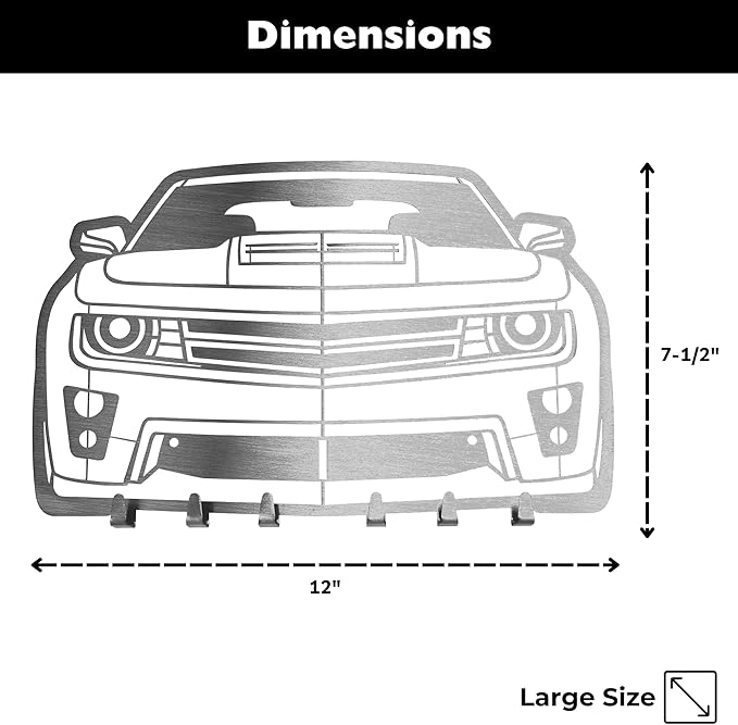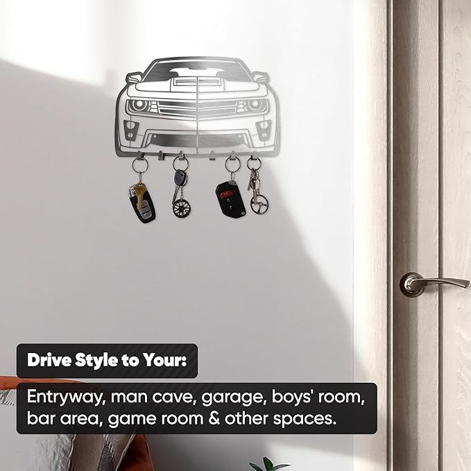 MOOH Car Key Holder for Wall - Metal Automotive Key Holder with 6 Hooks - Unique Car Gift for Men, Women, Car Lovers & Enthusiasts - Cool Man Cave Decor (Chevy Camaro 2014, Stainless Steel)