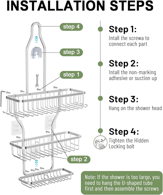 - EASY TO INSTALL: Don't worry about drilling holes in the wall! All you need to do to install this shower caddy over the showerhead is to use a screwdriver to assemble the various parts. It is worth noting that: if the large size of the showerhead needs to unscrew the showerhead before installation