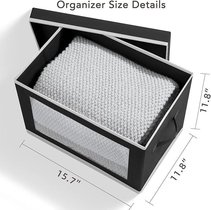 Storage Boxes with Lids - 4 Pack Fabric Clear Window Storage Bins, Large Decorative Storage Bins with Handles, Linen Closet Organizer for Clothes, Towel, Blanket, Black