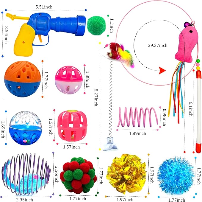 - Value Cat Toys Combo Set - It contains 9 different toys, totaling 84 pieces, including cat spring toy, cat wand toy, cat bell ball toy, crinkle cat toy, cat sparkle toy, plush ball toy and so on. This variety pack toys fits all indoor cats and It's the best holiday and birthday gift for your cat and all cat lovers.