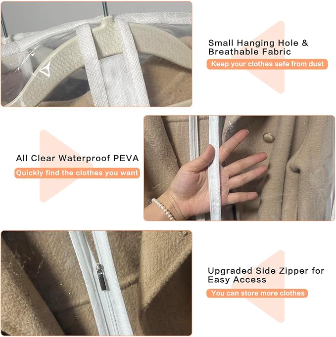 - 📣【DURABLE & LONG-LASTING】:Made of soft and durable PE material with a thickness of 50gsm, This upgraded version clear garment bags for storage is washable, lightweight and built to last. Dustproof and water-resistant plastic garment bags protect your delicate clothes against dampness, dust, pet hair, and keep them fresh and wrinkle free!