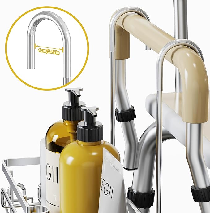 - Convenient Multifunctional Storage: It can store shower gel, shampoo, conditioner and other bathing necessities, and the side hooks can hang bath balls, bath brushes and razors. The groove design in the middle can also fix the shower head.