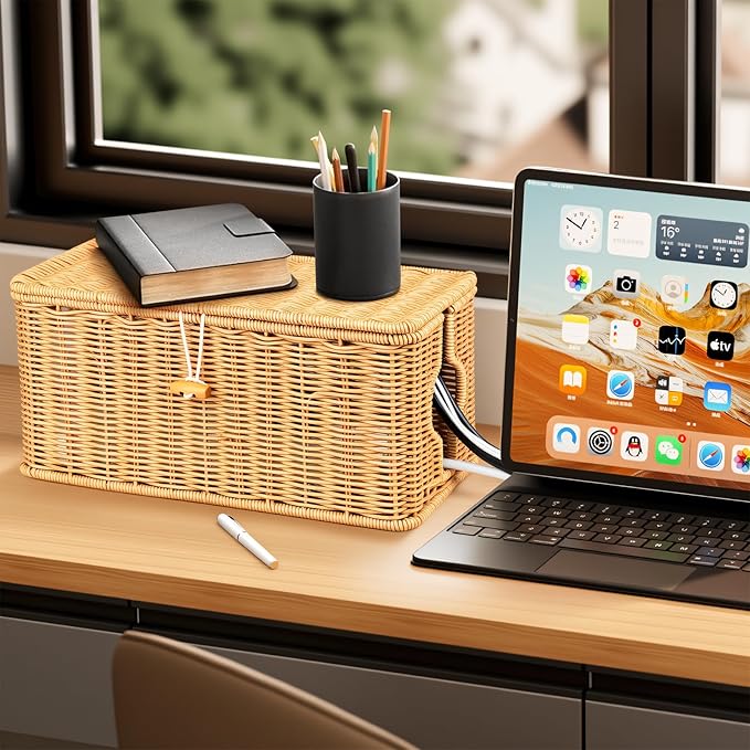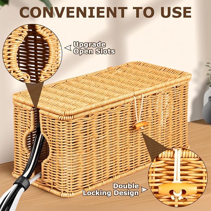 - 【Efficient Heat Dissipation】Cable organizer box adopts premium imitation rattan materials and interwoven mesh structure weaving technology, which has excellent heat resistance and efficient heat dissipation. Escort your home safety