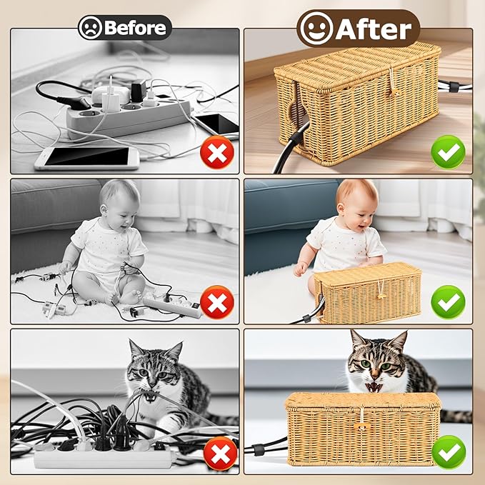- 【Handwoven Imitation Rattan】Cable management box is made of exquisite hand woven imitation rattan. Not only does it combine the beauty of traditional rattan weaving techniques, but it is also more environmentally friendly and durable. It is definitely a good helper for organizing cable and decorating spaces