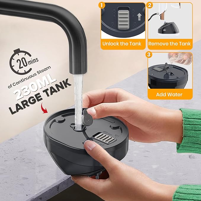 - ๐๐ฎ๐ฟ๐ด๐ฒ 230๐บ๐น ๐ช๐ฎ๐๐ฒ๐ฟ ๐ง๐ฎ๐ป๐ธ โ 15-20 Minutes of Continuous Steam โ Our upgraded water tank provides up to 15-20 minutes of powerful, uninterrupted steam, allowing you to de-wrinkle multiple outfits in one go. No need for frequent refills, making it perfect for home use, professional garment care, or even steaming upholstery and curtains.