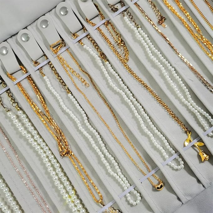 Portable Jewelry Roll Untangled Secure Necklace Travel Storage Bag Displays Holder 16 Chain (Beige)