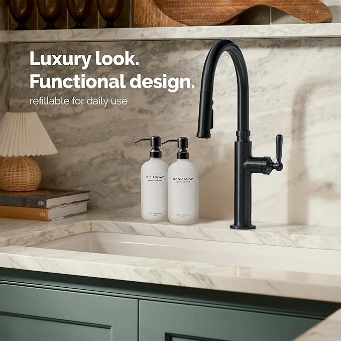 - BUILT TO PERFORM – Each dispenser is topped with a matte black stainless steel pump that’s as durable as it is refined. Rust-resistant, smooth to use, and designed to complement any modern kitchen or bathroom.