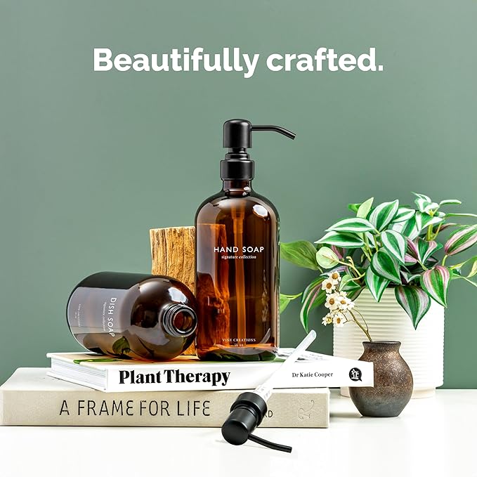Vine Creations Amber Glass Soap Dispenser Set, Dish Soap and Hand Soap Dispenser Set with Stainless Steel Pump, 16 oz Glass Dispensers for Kitchen or Bathroom Decor (Amber Bottle/Matte Black Pump)