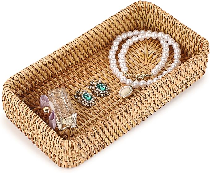 - Multi-Purpose Organizer Tray: This basket tray basket is perfect for everyday storage and display. Place it on your entryway table, living room, vanity, bedroom, or kitchen to keep essentials like keys, remotes, phones, jewelry, or perfume neatly organized in one place.It’s also great for serving food, drinks, coffee, tea, water, cake, dessert, snacks, dry fruit. This rattan tray is both practical and elegant for your home