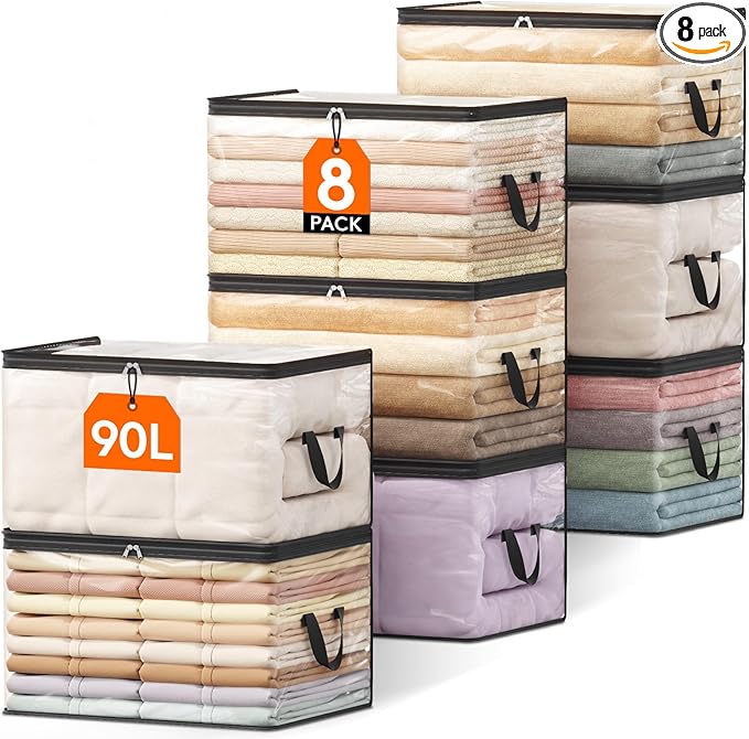 - Generous Capacity: Available in sets of 3, 4, 6, or 8, each transparent storage bag measures 23.6"(60cm) x 16.9"(43cm) x 13.8"(35cm) and provides a spacious 90 L capacity which is not too bulky and not too small. Each plastic blanket storage bag with zipper can hold 2 king size comforters, 18 hoodies, 15 sweaters, 6 blankets, ensuring all your storage needs are met in one convenient place.