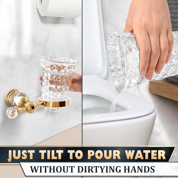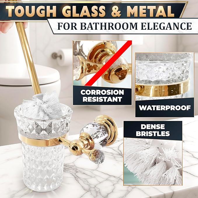 - Elegant Crystal & Gold Accent: Sparkling crystal body with polished gold toilet brush handle makes this stylish toilet brush and holder set gold a chic wall mounted addition to your bathroom décor