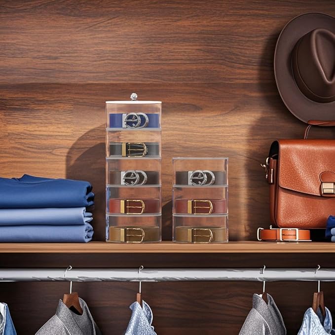 - 【5-Tier Belt Organizer with Clear Acrylic Design】 Hold 5 belts vertically in this 5-tier organizer! Transparent acrylic layers let you see every belt instantly. Non-slip edges prevent sliding, perfect for closets, cabinets, or dressing rooms.