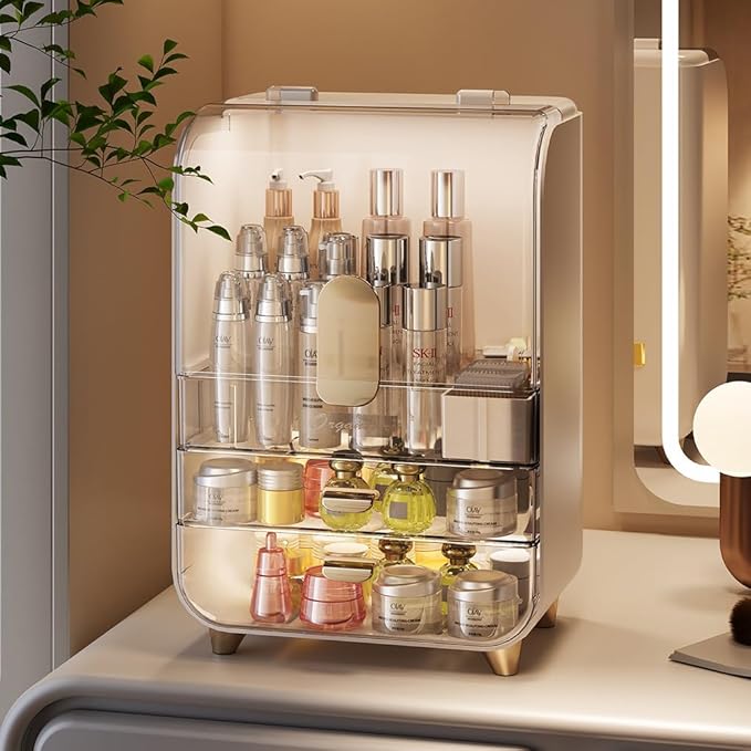 - 3, Dustproof & Water-resistant: The vanity makeup organizer is built with crystal-clear acrylic cover which blocks bathroom humidity, dust, and pet hair while showcasing your collection. The 2 tier smooth-gliding drawers will keep your valuable skincare products secure