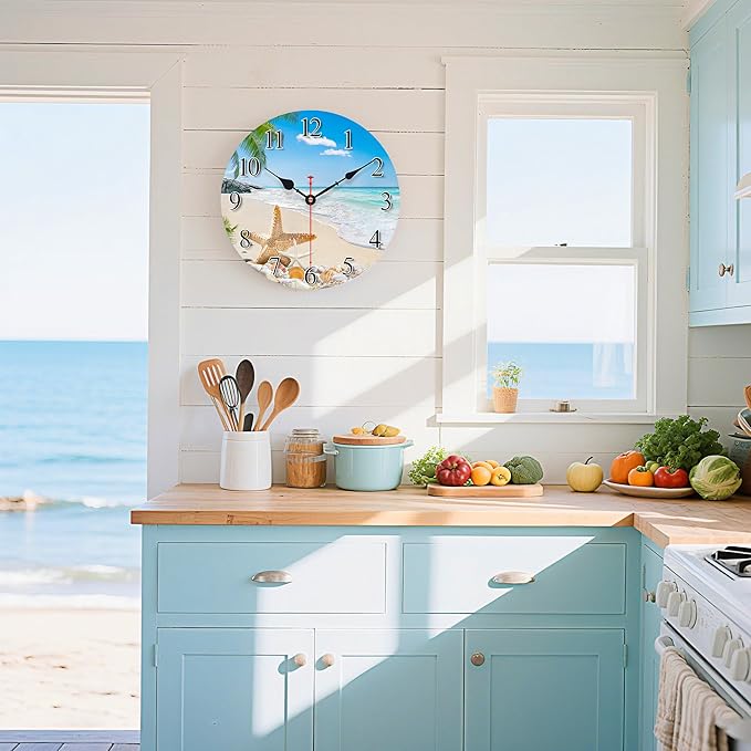 - π RETRO Ocean Starfish Beach CLOCK: Beautiful Ocean Sea Coastal design makes it an ideal decoration for kitchen living room, bedroom, kitchen, farmhouse office, cafe, restaurant, bar or hotel.