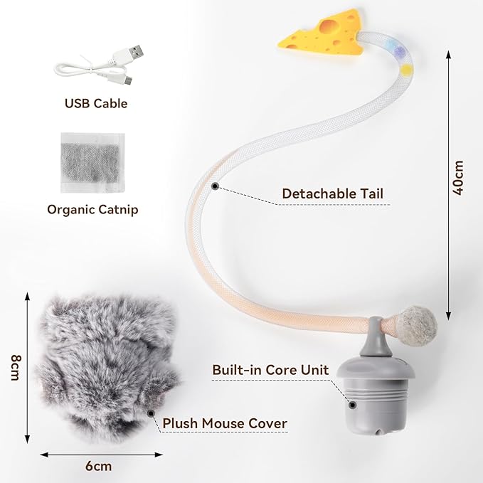 - Lifelike & Irresistibly Cute – This plush rolling mice with furry fabric, shiny eyes, pink ears, whiskers, irresistibly charming. The long wiggling tail,squeaker instantly grab your cat’s attention, triggering their natural hunting instincts.If your cat is a bit timid, you might let it play with the toy before activating it, so it can get acquainted with this new friend first.
