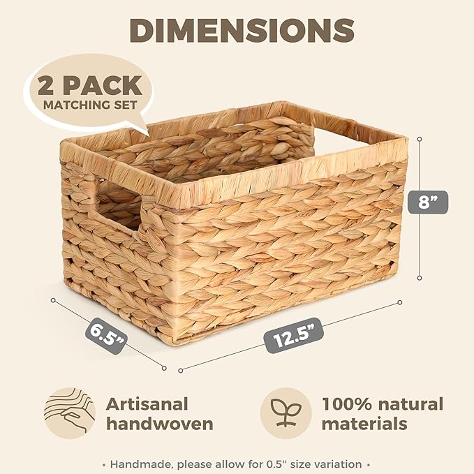 Set of 2 Wicker Shelf Storage Baskets for Organizing - Natural Durable Water Hyacinth Woven Basket Pantry Bin Organizers for Shelves with Handles for Home & Decor Organization, 12.5” x 8” x 6.5”