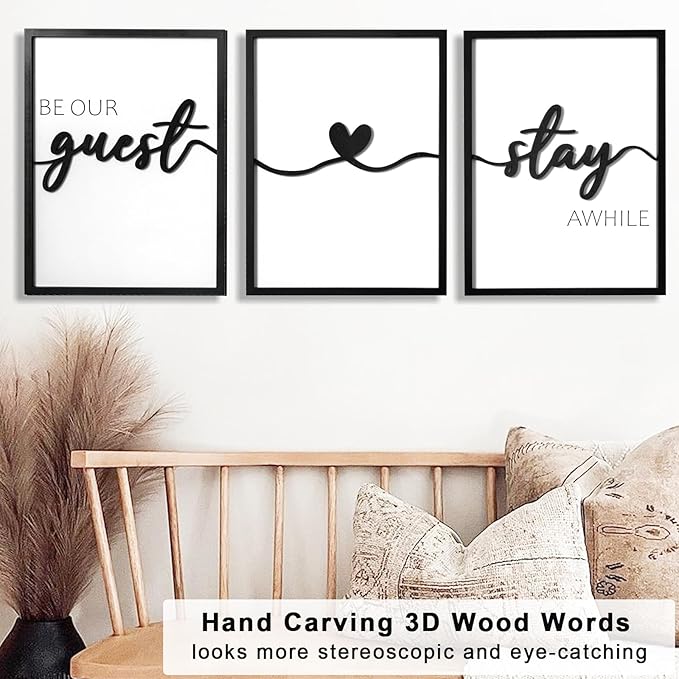 3D Wood Be Our Guest Wall Art, Black and White Be Our Guest Wall Decor Sign, Framed Guest Room Wall Decor(Ready to Hang, 12x16 inches, Set of 3, Framed)